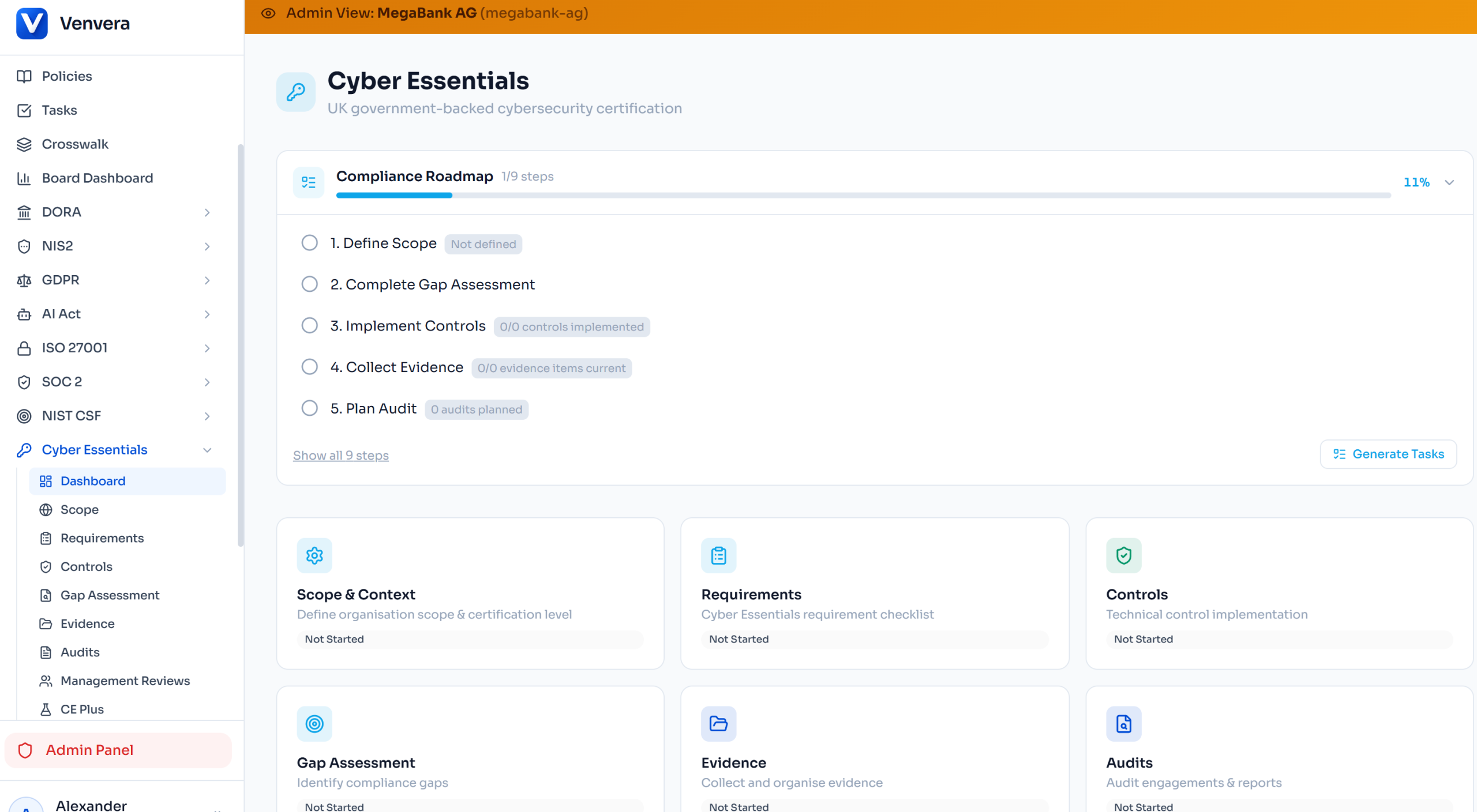 Venvera is one of the very few multi-framework compliance platforms that includes Cyber Essentials as a natively supported framework. This is not a custom mapping exercise or a template you build yourself. Cyber Essentials is a first-class framework alongside DORA, ISO 27001, GDPR, SOC 2, NIST CSF, NIS2, EU AI Act, NDPA, UAE IA, and CMMC - 11 frameworks available starting at just €299/month.