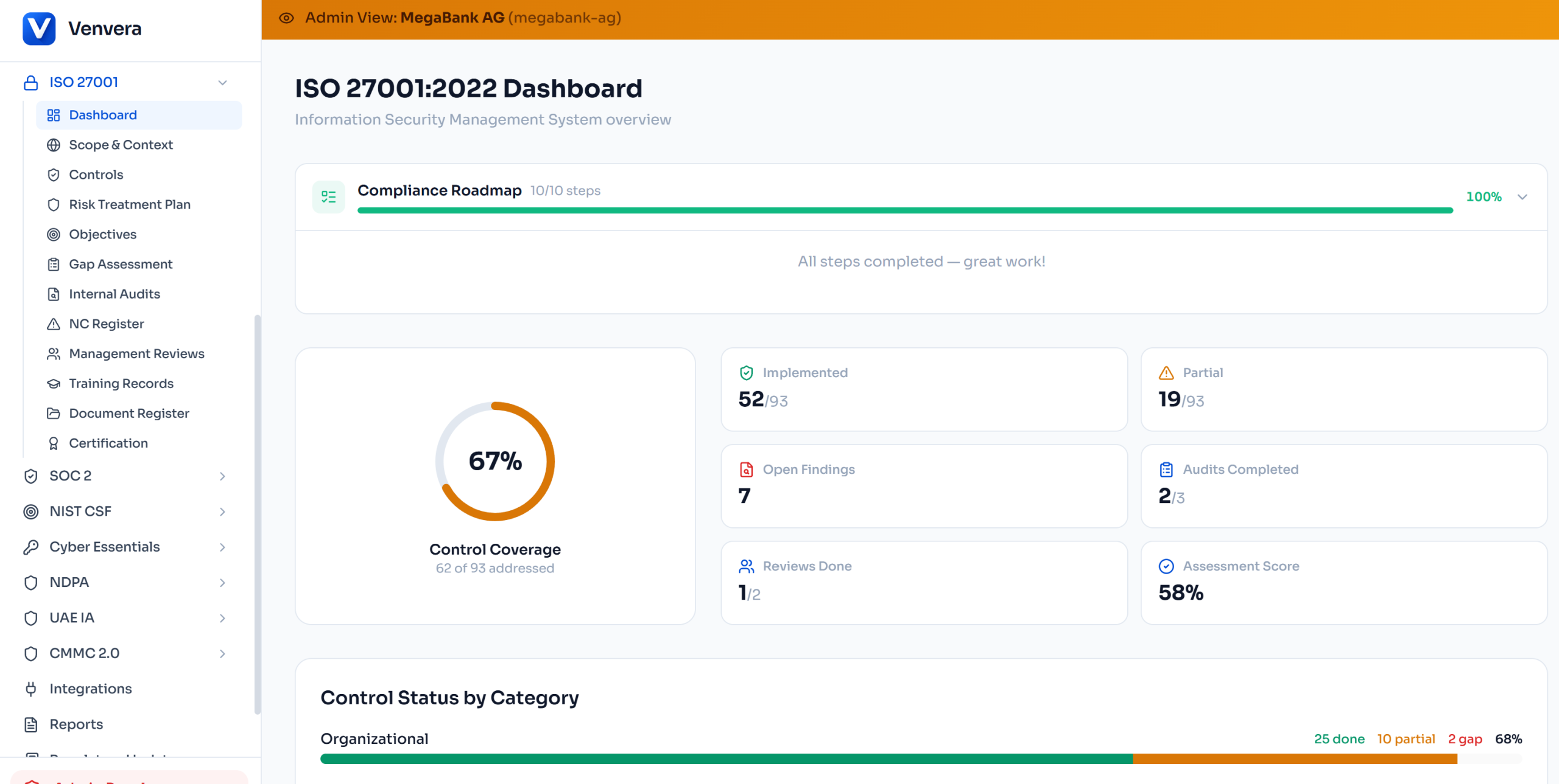 With Venvera, these mappings are pre-built. Every ISO control you implement automatically provides compliance credit for the corresponding DORA, NIS2, and SOC 2 requirements - no manual cross-referencing needed.
